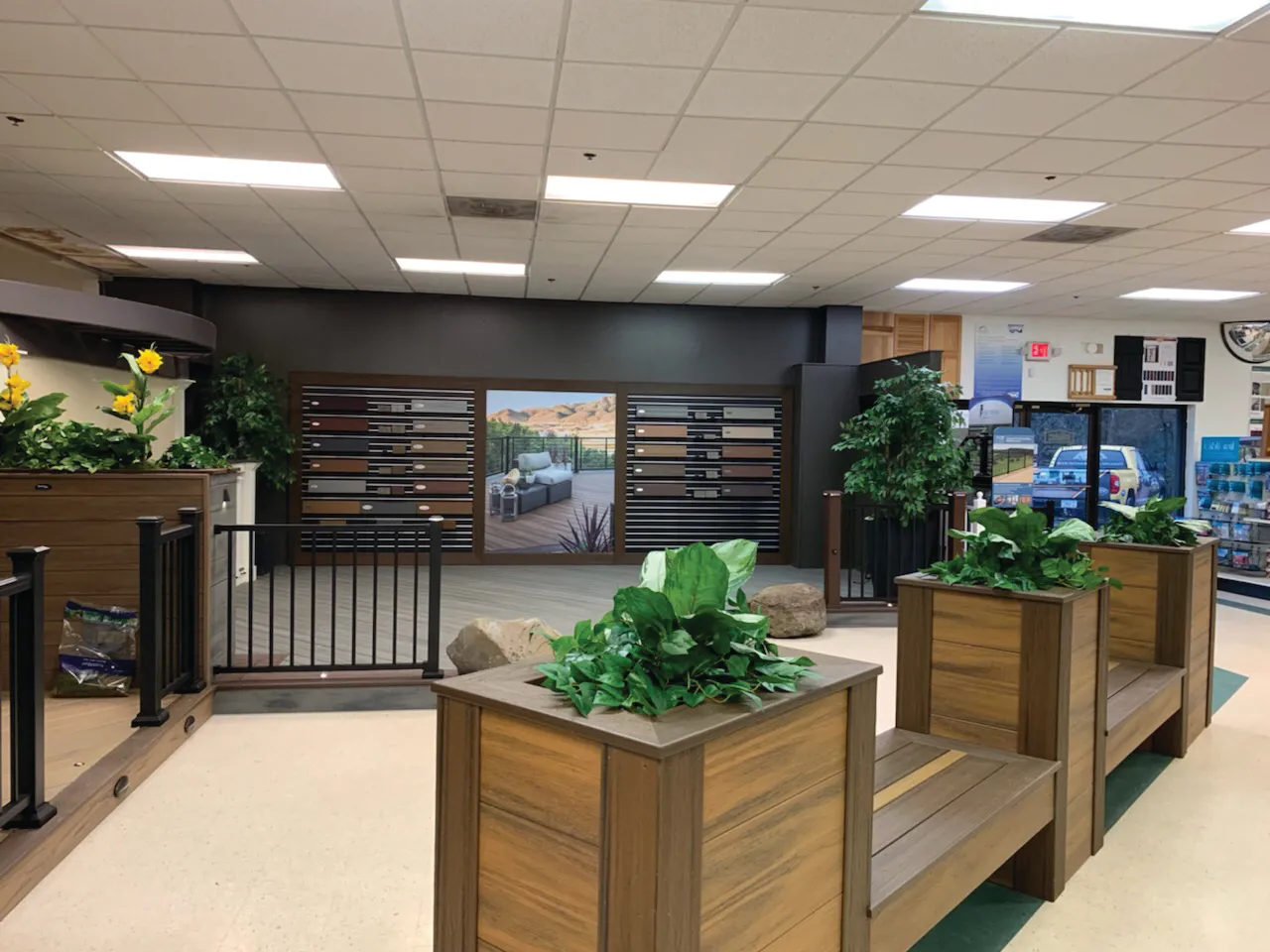 The Lawrenceville, Ga., branch features a 650-sq. ft. Deck Design Studio and two impressive exterior displays. One is built with Fortress railing options and Fiberon for the deck surface—with a cut-away to show the Fortress Evolution steel framing underneath. The second exterior display, similarly sized at about 1,280 sq. ft., displays all of the decking and railing options the location offers. Since the displays are out front, homeowners and contractors can check them out on their schedule, 24/7.