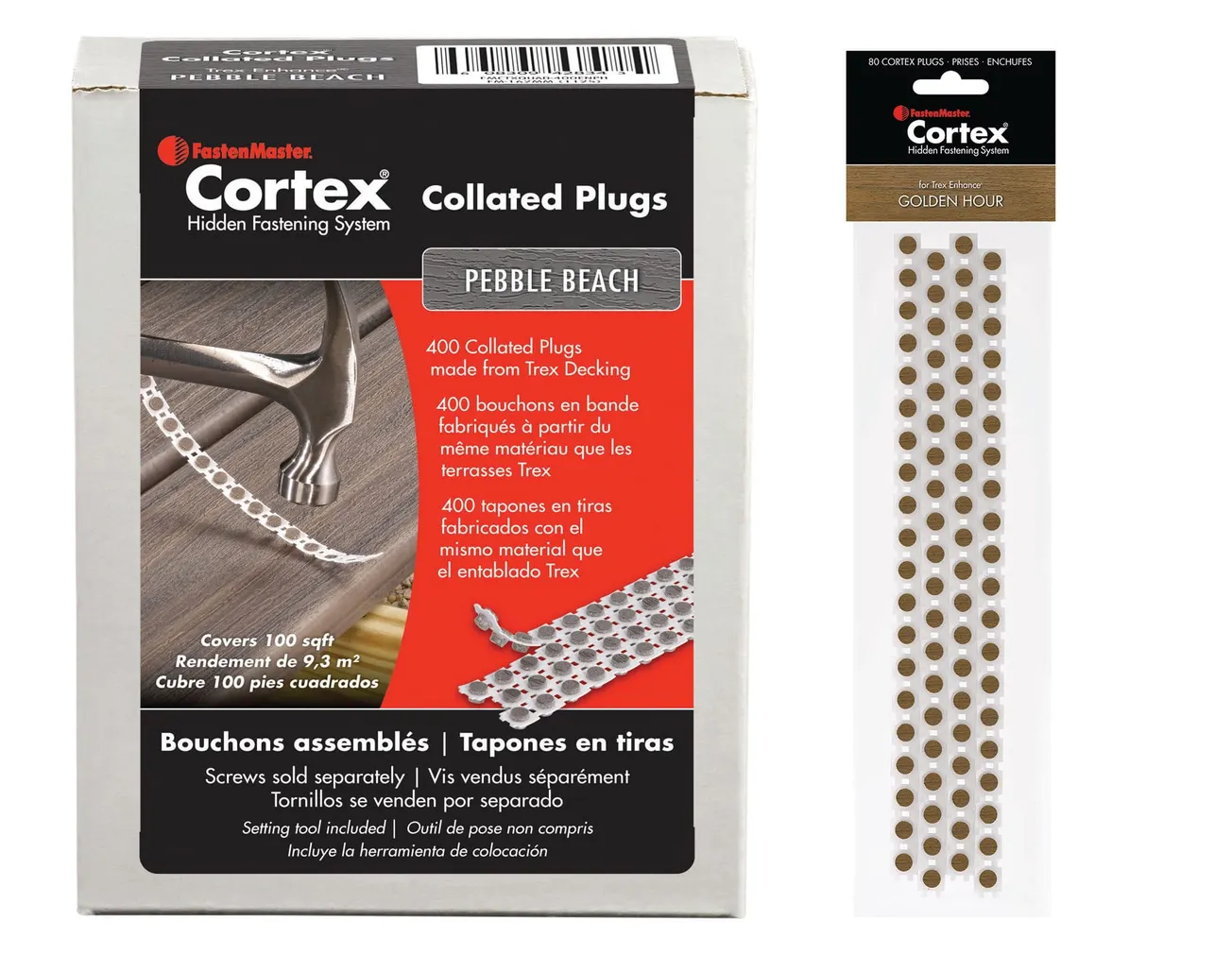 Each plug is made from the same Trex material as the board itself, providing a 100% color and texture match for a seamless matched finish. Collated plugs come pre-aligned for grain direction and can be installed up to 50% faster compared to loose plugs.