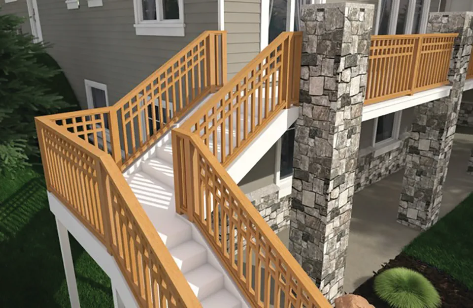 Three designs are offered: the Landmark, featuring a classic vertical railing style; the Torrey Pine, highlighting clean lines and two rows of grid squares; and the Bellevue, with its elegant geometric design. They come in wood, pre-primed, or pre-painted white.