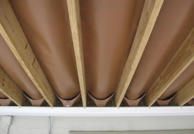 Below-the-joist systems consist of metal or vinyl panels retrofitted to the underside of deck’s joists with the panels sloping to a gutter installed at the deck beam for drainage.