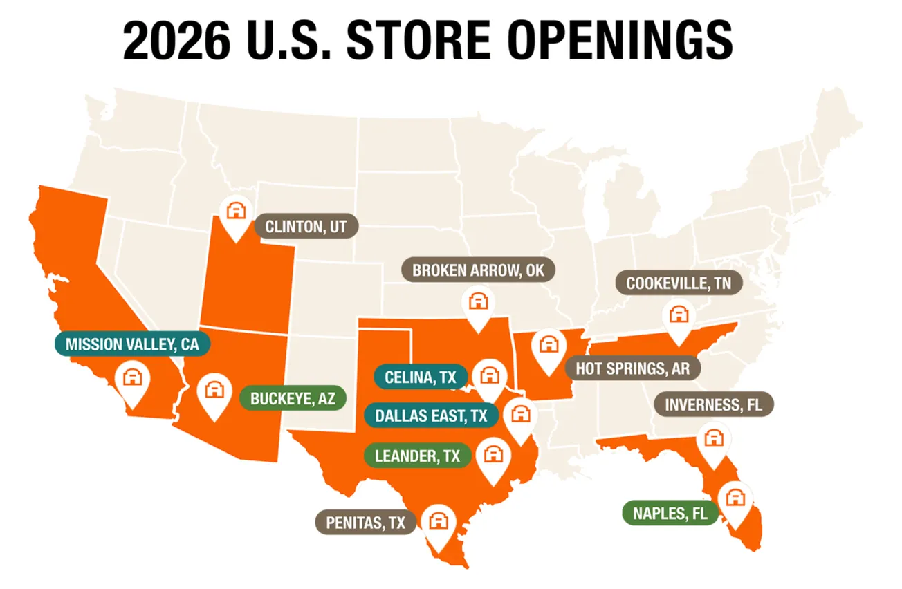 Openings include this spring in Leander, Tx. (Daniel Corbell, store manager); Buckeye, Az.; and Naples, Fl.; this summer in Mission Valley, Ca.; Celina and East Dallas, Tx.; and this fall in Hot Springs, Ar.; Broken Arrow, Ok.; Inverness, Fl.; Clinton, Ut.; and Cookeville, Tn.