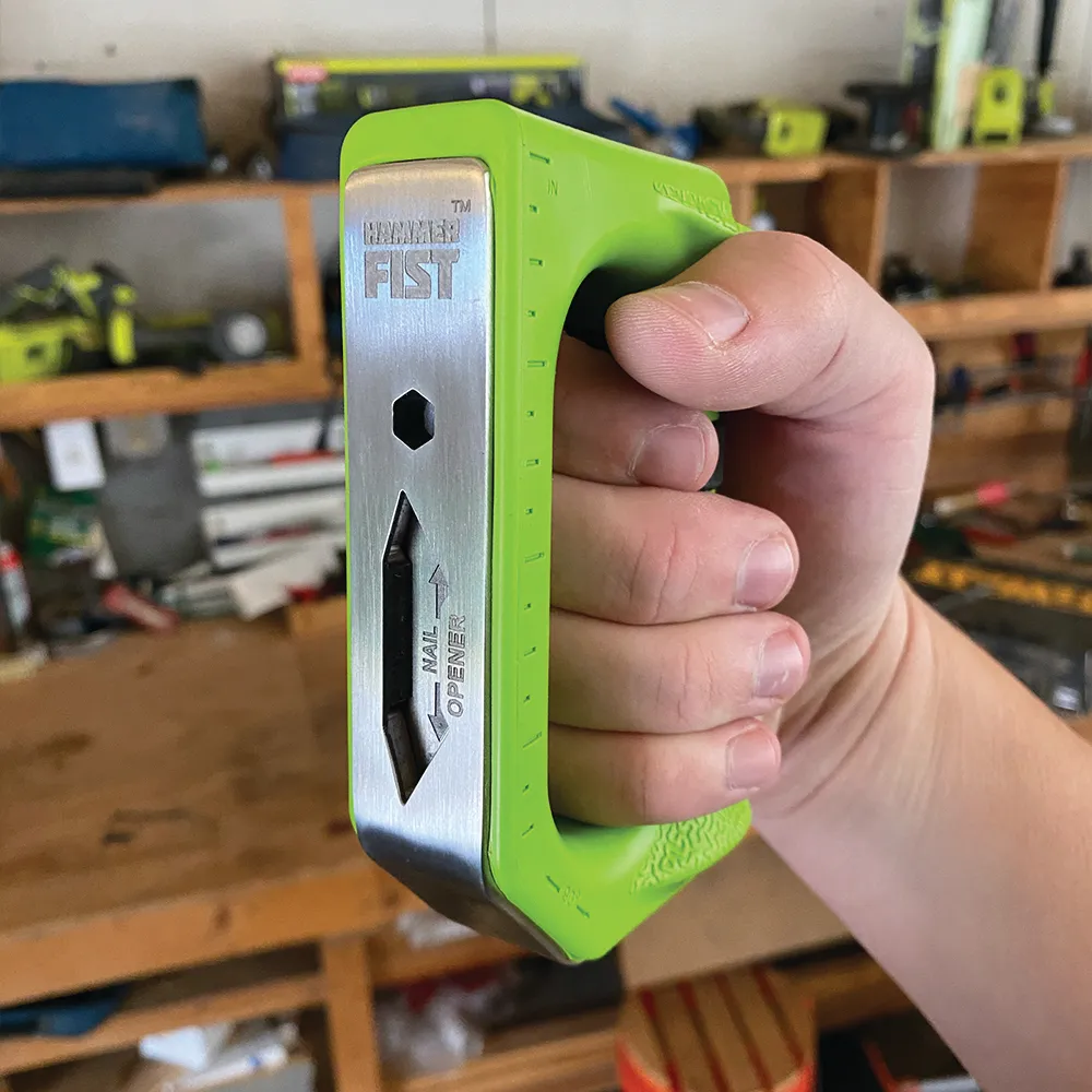 Ideal for all ages and skill levels, the neon green tool functions as a non-marring mallet, 90˚ square, SAE and metric ruler, dual nail puller, bottle opener, hex driver, and ball peen hammer.