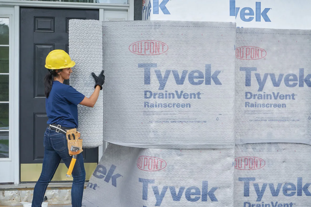 The DuPont Tyvek DrainVent Rainscreen provides advanced protection against moisture damage in exterior wall systems.