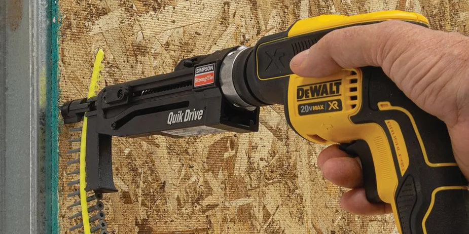 PPHD screws can be purchased in bulk quantities for hand-drive applications or collated for auto-feed driving with the Simpson Strong-Tie Quik Drive PRO300SG2, PRO250G2, and PRO200SG2 auto-feed screw-driving systems. The fasteners are also available in two levels of corrosion resistance—the Quik Guard coating is suitable for a wide variety of exterior applications and the yellow-zinc coating is for dry-service and low-corrosion environments.