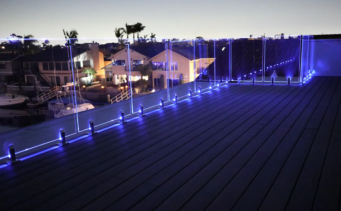 IG Railing is a patented, frameless glass railing system featuring over 12 LED color options via WiFi or remote control.